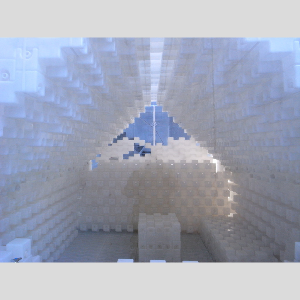 用いられている素材はいずれも、建築の構造素材としてまっとうなものはない。空気で膨らませたビニール袋、グラスファイバーを組み込んだコンクリートブロック、レゴブロックのようなポリタン、薄いアルミパネル、どこにでもあるビニール傘、大判のセラミックタイル。いずれも設計者は隈研吾であり、たまたまポリタンの架構はギャラリー間での隈さんの展覧会場で見ていた。この展示では真面目なのかふざけているのか、正直なところ一見しただけでは判断がつかなかった。しかし応募資料を一見するなり、編集屋根性をくすぐられたのは、それぞれの素材に対して真面目に応力解析がなされていたからだ。