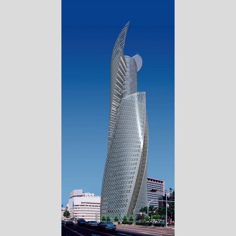 モード学園スパイラルタワーズは、三つの専門学校の3つの教室群が上階に行くに従い徐々に位置を変え、ねじれたような外観をもたらしている。常時の荷重や施工時にもねじれが発生する構造体に対し、建物中央部に楕円形のコアを設け、これにラチスチューブとして強剛なねじれ剛性を持たせ対処している。さらに3種類の制振構造を付加することで高い安全性と透明感溢れる軽快な外周フレームを実現している。一方は複雑な機能を持つ大スパン建築であり、一方は複雑な形態を持つ超高層建築である。