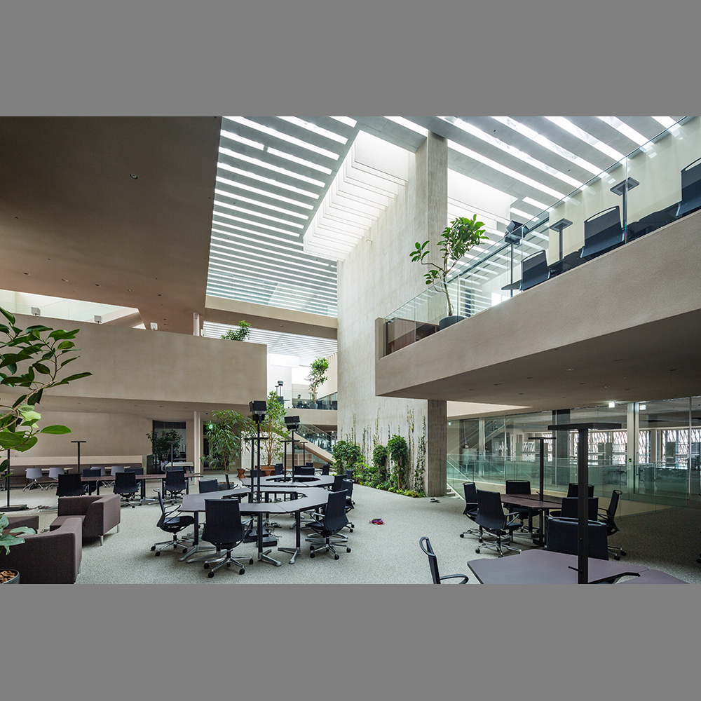 さらに屋根のスリットから取り込まれた光は、耐震要素である壁を反射板とすることで、執務スペースを柔らかな光で満たしており、機能と構造、環境等のあらゆる要素が見事に統合されている。