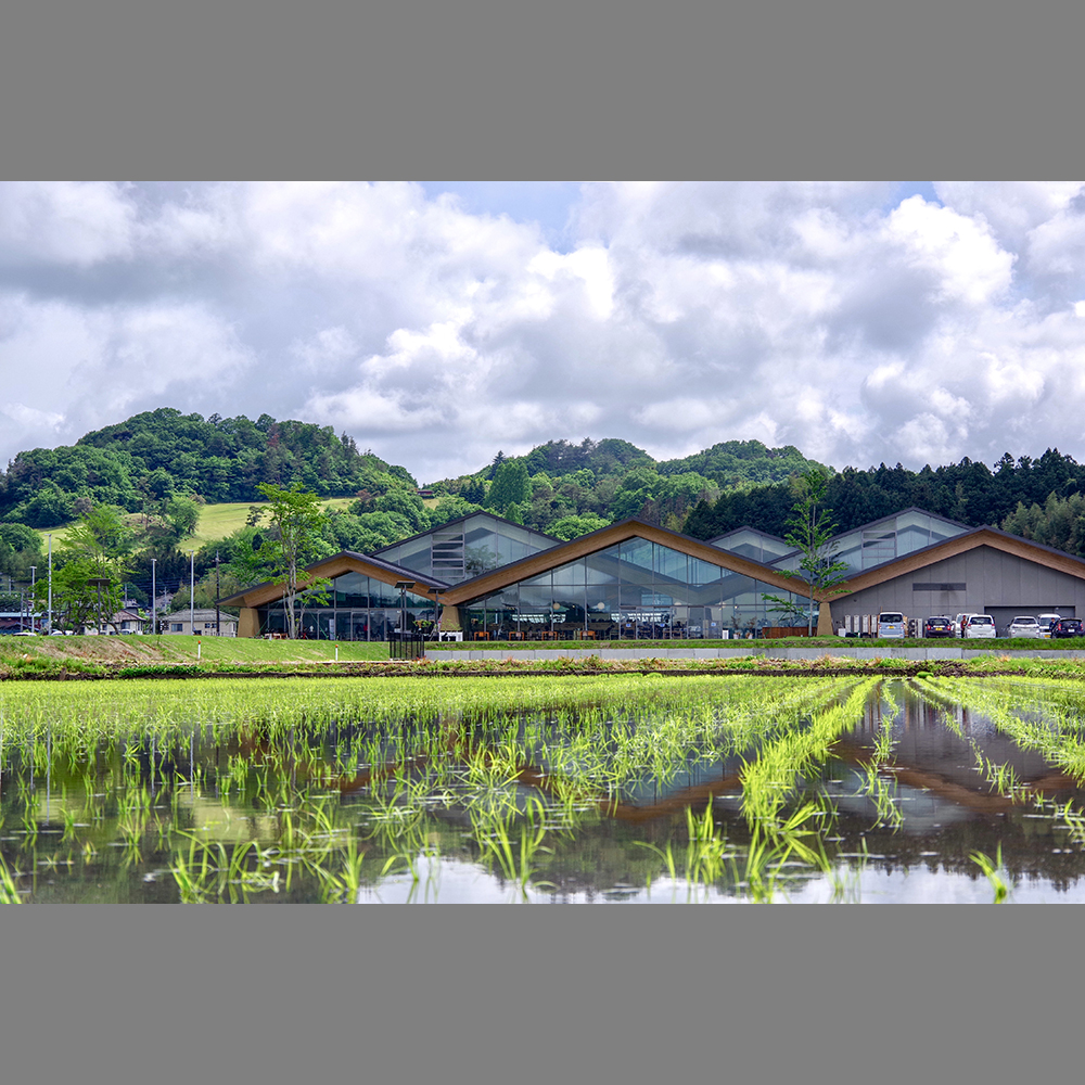 受賞作品である本建物は、焼き物で知られる栃木県益子町につくられた道の駅である。田園の中に佇み、背景に見える山並みに合わせた山形形状の木造屋根は、風景との一体化を図りながらも、ダイナミックな造形でもある。