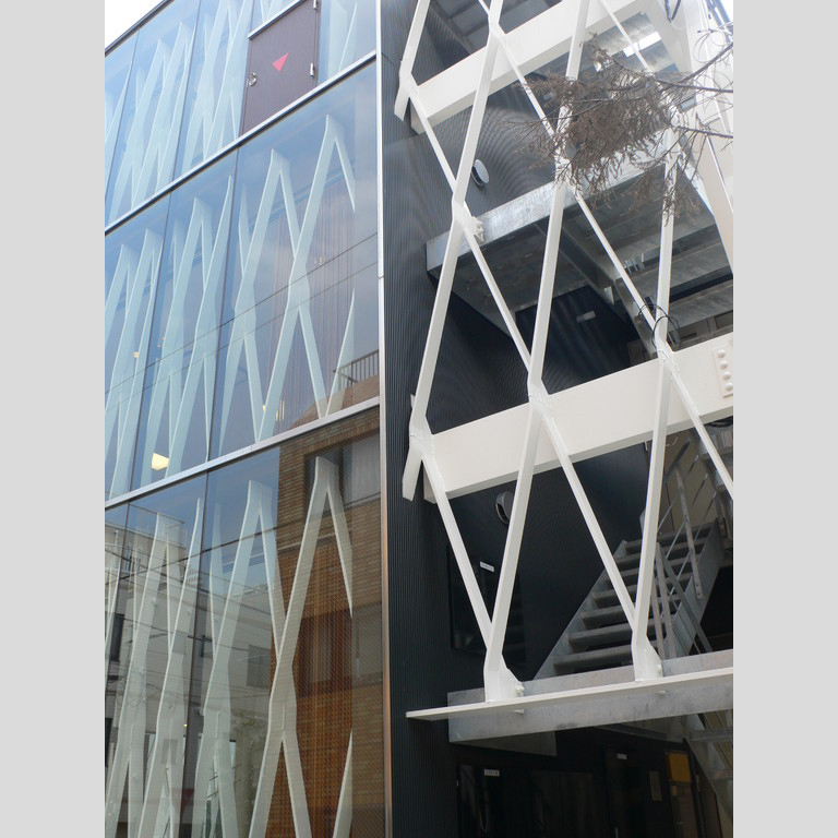 建築家はこれらの与件と、空間に必要なフレキシビリティから、建物の荷重(鉛直、水平)を外皮のみで処理し、しかも外皮に透明性を与える手法を、構造家と協議した。外皮の構造パターンに対する建築家の希望は、エキスパンド・メタルのような網状のイメージであったが、構造家はこれを無垢のフラットバーで構成することを提案した。
