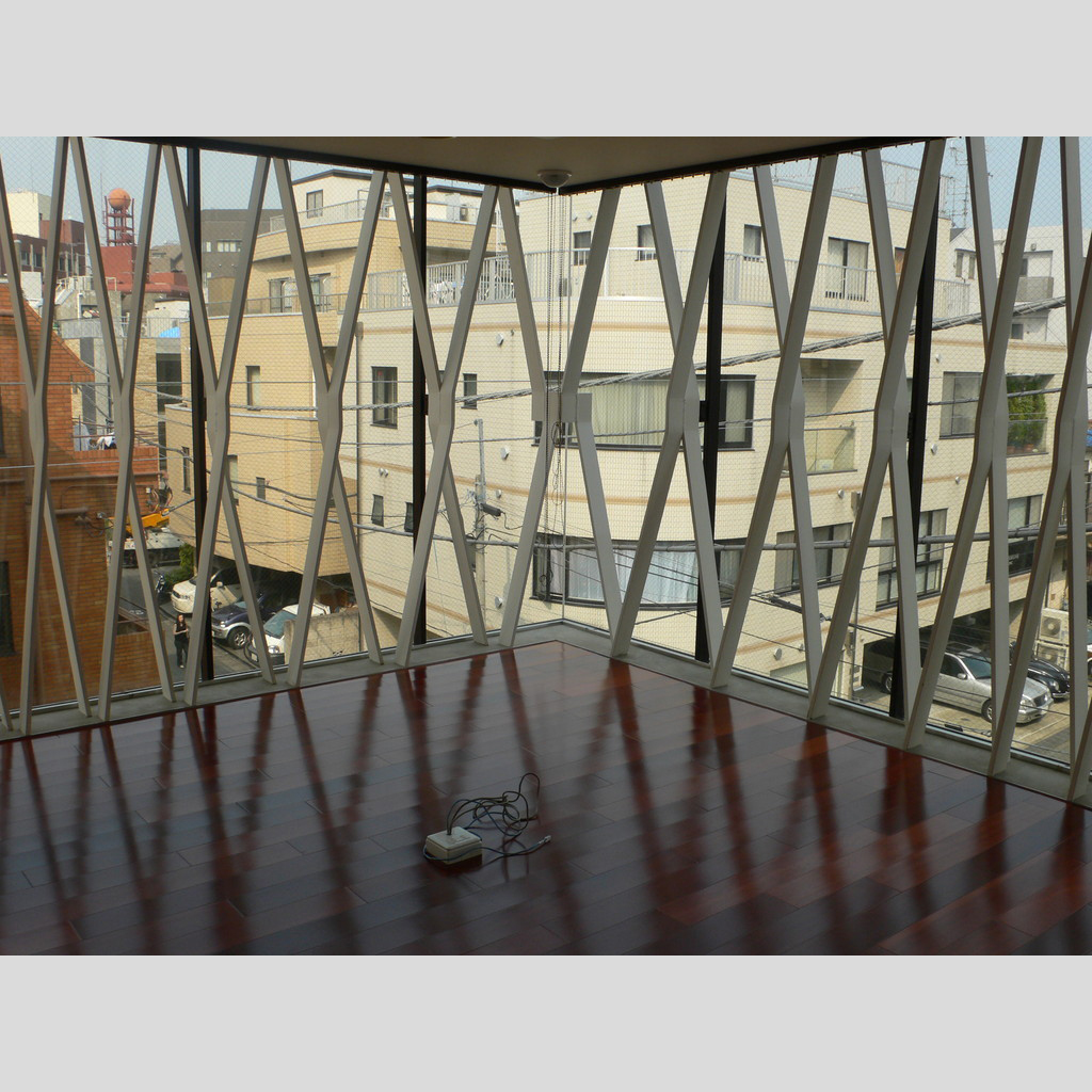 レイカズン本社ビルは、アパレルメーカーのヘッドクオータービルである。施主からの最大の与件は、敷地に対して最大限の床面積を確保してほしいと言うこと、また、1階は自社ブランドの洋服等を展示するショールームとして使用するので、内部のアクティビティーが外部に顕示できるような、透明性のある外壁がほしいと言うことであった。